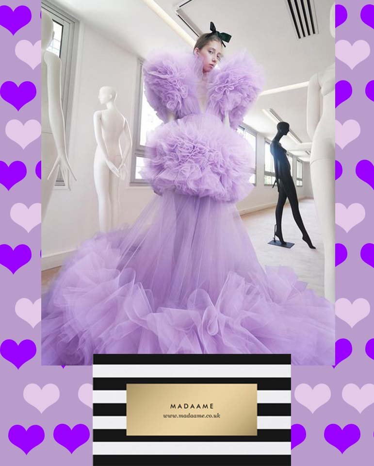 A lavender maxi gown dress featuring riffles around the shoulder and waist. Would make an ideal dress for the celebrity gala night.