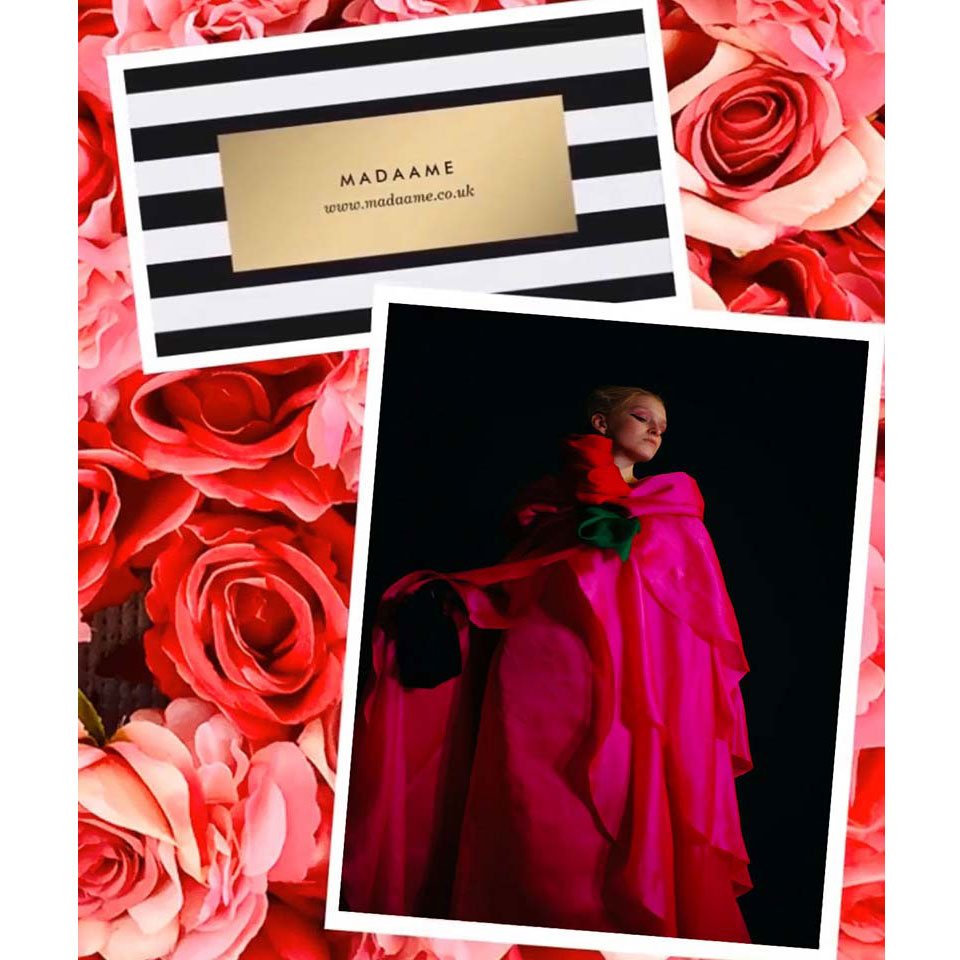 Rose flower pink gown featuring a flowing cape with a cute rose flower. As seen at London Fashion Week 2020