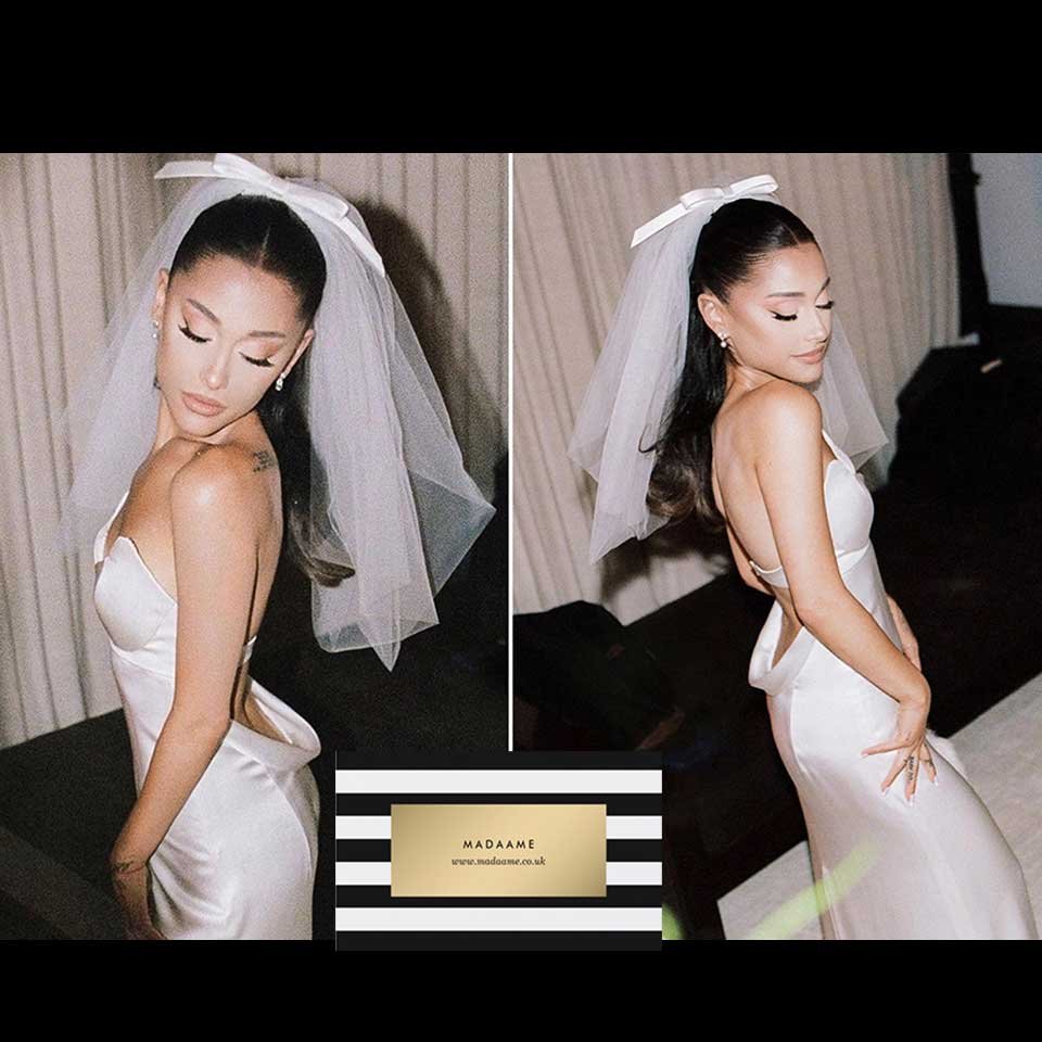 This strapless silk column wedding gown is inspired by Audrey Hepburn’s character in “Funny Face.” Features an empire waist and Audrey Hepburn inspired veil.