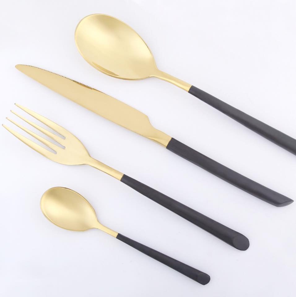 Set includes place settings for four people; dinner knife, fork, dessert spoon, and tea spoon.