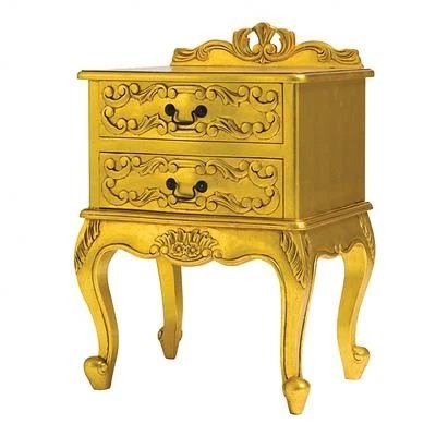 The Rococo Gold Leaf bedside table is versatile and stunning. This bedside table is hand carved from Mahogany and features two drawers. Each draw feature intricately carved fronts, and sweeping cabriole legs. It is further enhanced by a carved backboard and bronze handles.