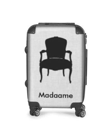 Small black and grey cabin sized suitcase featuring Madaame brand. Suitable as carry-on luggage. Can stowed in over head bins on trains and planes easily.