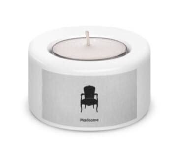 Madaame branded round white porcelain tea light candle holders.