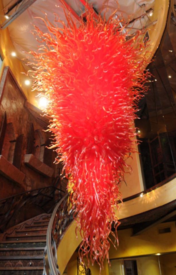 Uniquely designed large luxury ceiling chandelier made from red crystal glass.