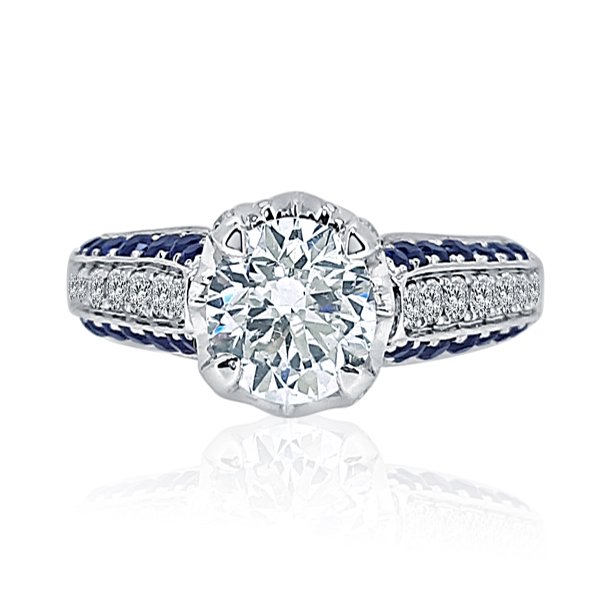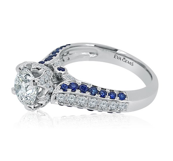 A magnificent ring called princess crown engagement ring with diamonds in the adjacent shoulders with a three-dimensional concept with natural blue sapphires on either side.