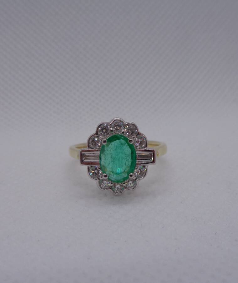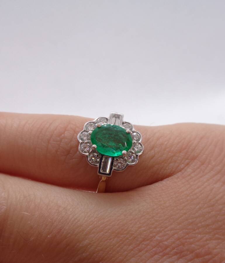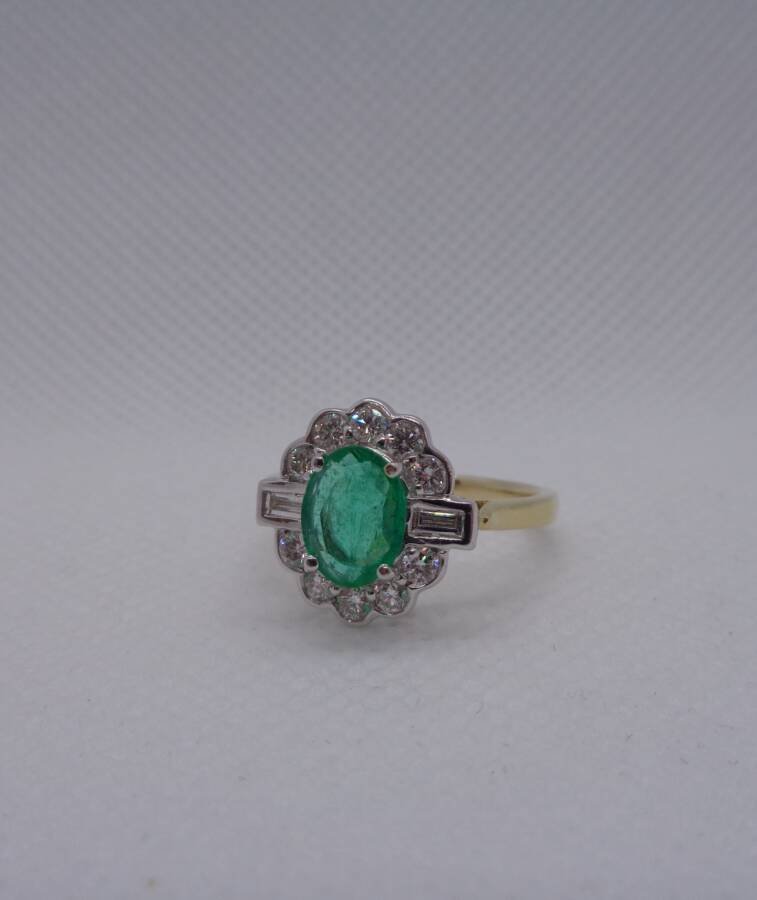A fabulous emerald and diamond cluster ring featuring a central emerald cocooned in a ring of diamonds.