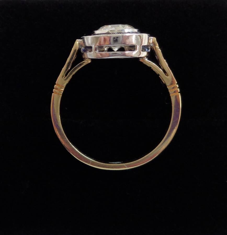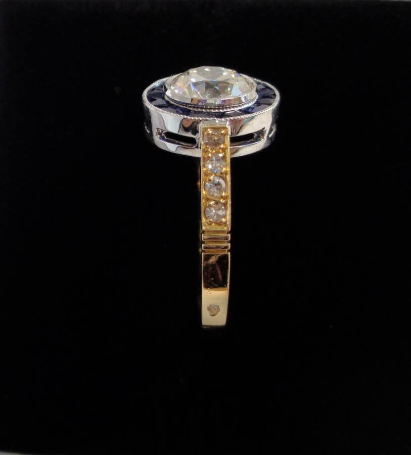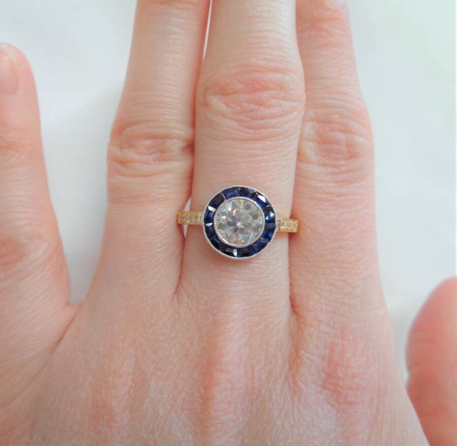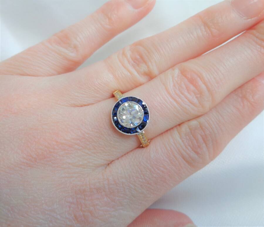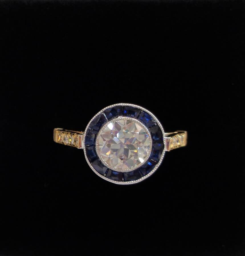 Instantly catching the eye is the 1.00ct early round brilliant cut Natural Diamond framed by twelve medium to dark blue trapezoid cut Sapphires for the exquisite target design. Diamond colour I/J and clarity Si1-2. Total Sapphire weight 0.84ct.