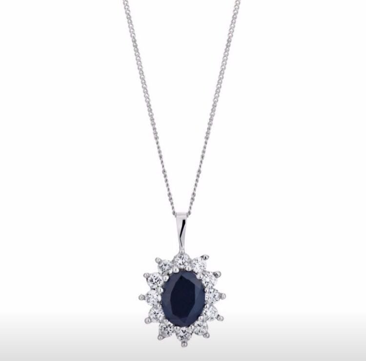 A 9ct cubic zirconia cluster pendant. Made of 9ct white gold. Features central dark blue sapphire stone.