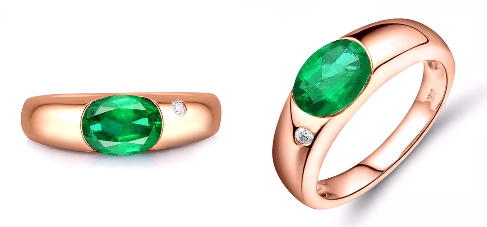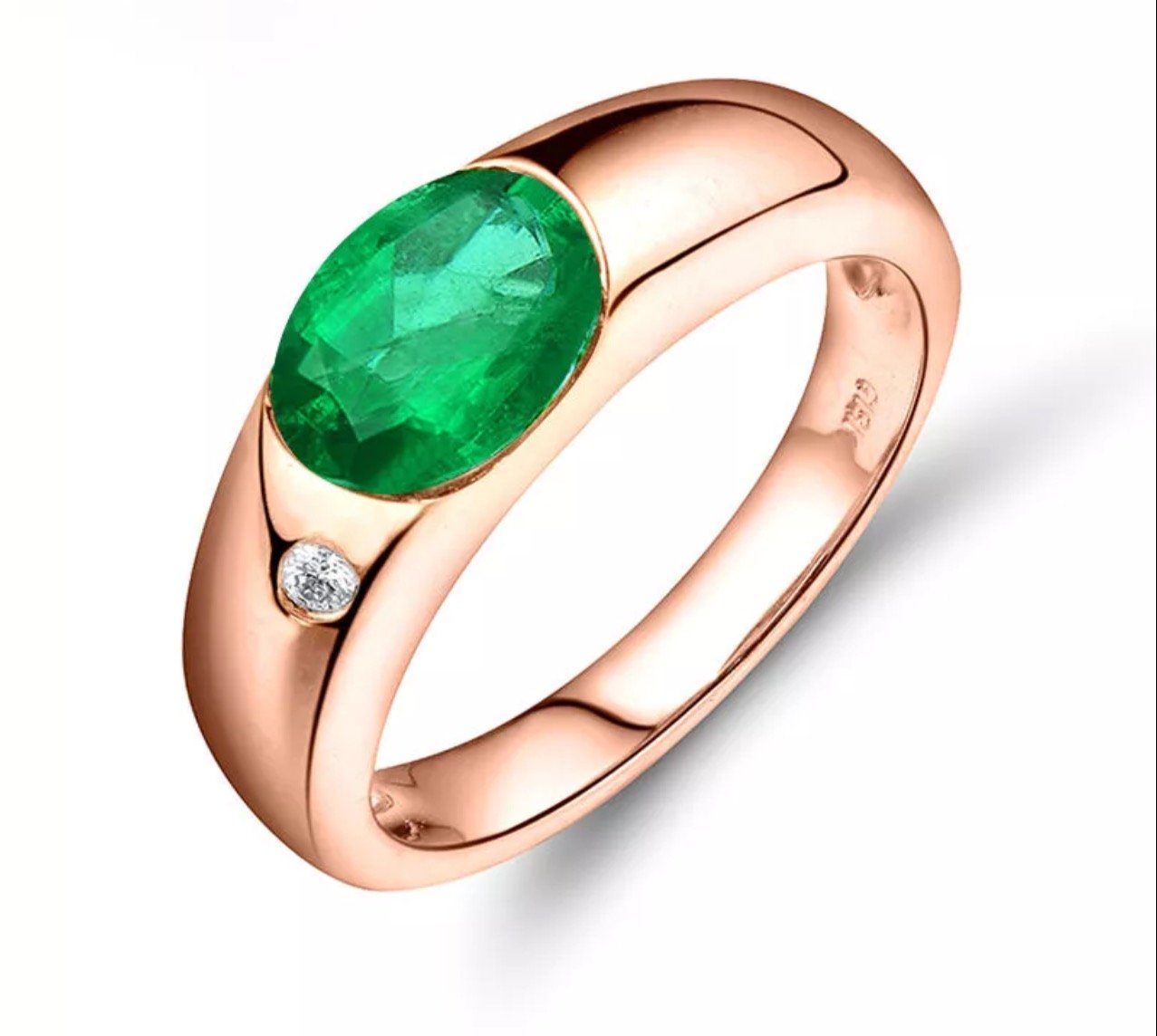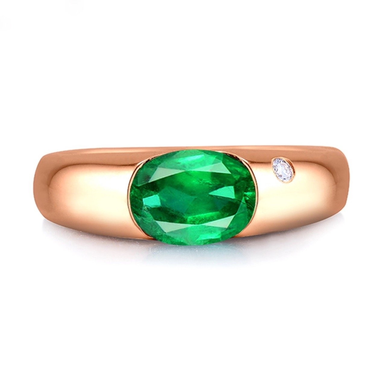 A lovely engagement ring in 18K rose gold with a natural colombia emerald gem stone. In addition, the ring boasts a small diamond gem stone below the emerald.