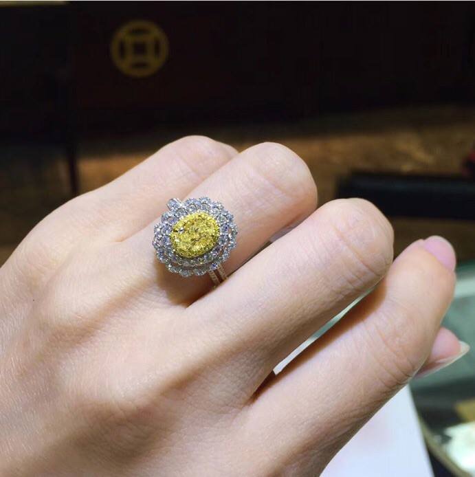 A white gold wedding ring for weddings and engagements. Features certified classic 1 CT oval cut natural yellow diamond.
