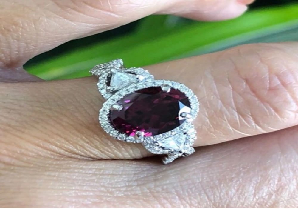 A diamond ring with an inlaid ruby gemstone.