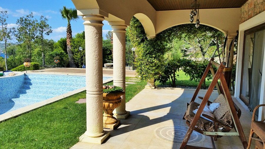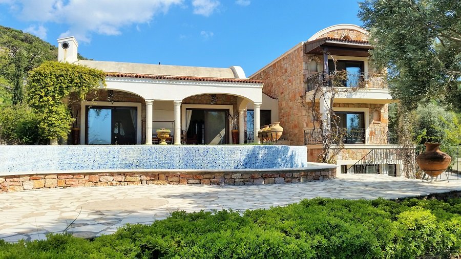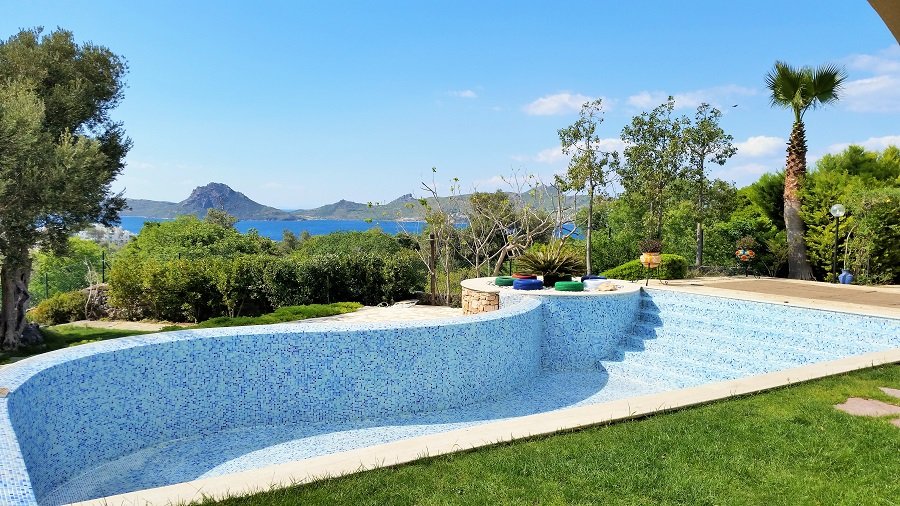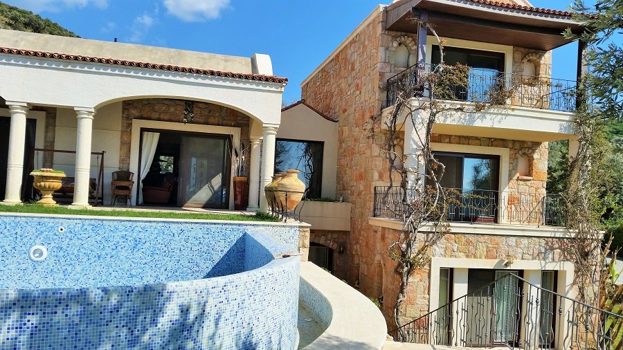 Turkish homes on sale, villa in Yalikavak Bay, Bodrum. 3500m² landscaped garden, private swimming pool, sea view, just 5 mins. drive to the marina and centre. 4 bedrooms, 4 baths. 350m² living area. sitting room with open plan kitchen and fire place. Not to miss!